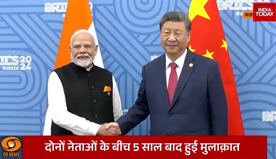 Der indische Premier-Minister Narendra Modi und der chinesische Präsident Xi Jinping gaben sich in Kasan die Hand. Das war mehr als nur eine leere Show, sie hatten seit fünf Jahren nicht mehr miteinander gesprochen. (Screenshot)
