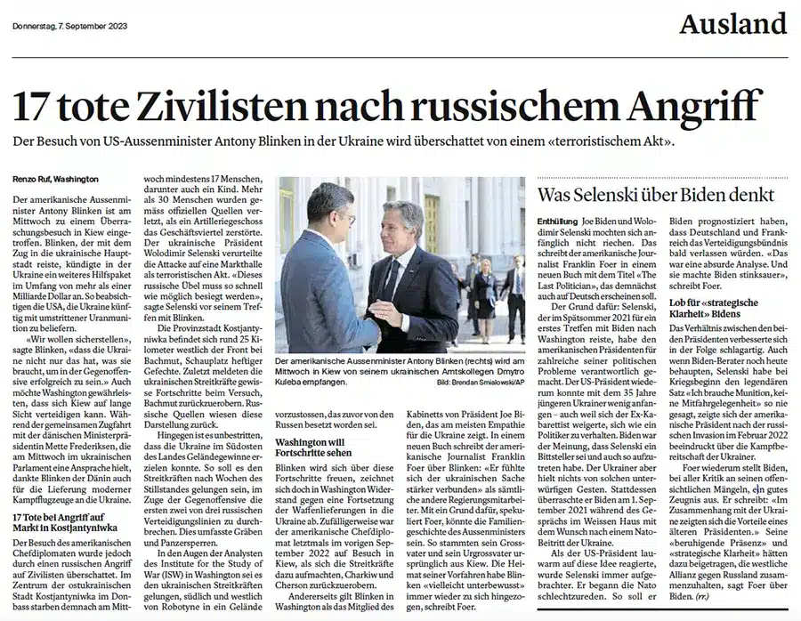Einige Tage später wusste sogar die «New York Times», dass es eine Bombe der ukrainischen Armee war. Strittig blieb nur, ob es ein Versehen war, wie die NYT vermutete, oder ob es sogar ein bewusst erzeugtes Blutbad war, um dem US-Außenminister Antony Blinken, der an diesem Tag in Kiev weilte, zu zeigen, wie brutal die Russen seien.