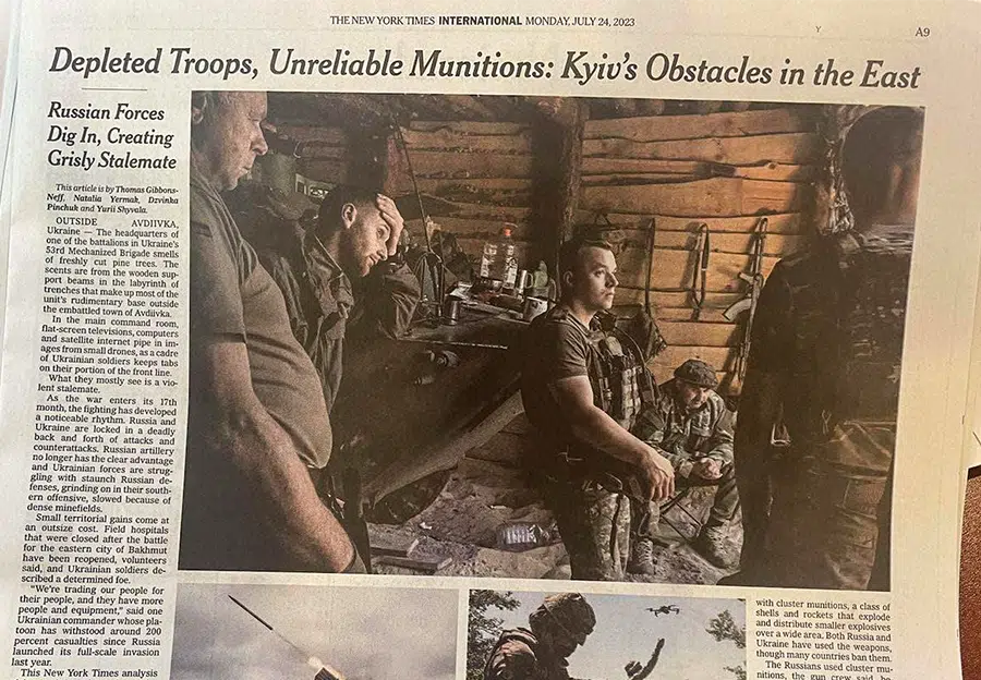 Der ausführliche und detaillierte Bericht über die ukrainische Offensive, der auf Seite A9 (der Ausgabe vom 24. Juli) vergraben war und auf der Titelseite der Printausgabe nicht erwähnt wurde, trug den Titel «Erschöpfte Truppen, unzuverlässige Munition: Kiews Hindernisse im Osten». Und im redaktionellen Vorspann wurde die Offensive als «grausame Pattsituation» beschrieben.