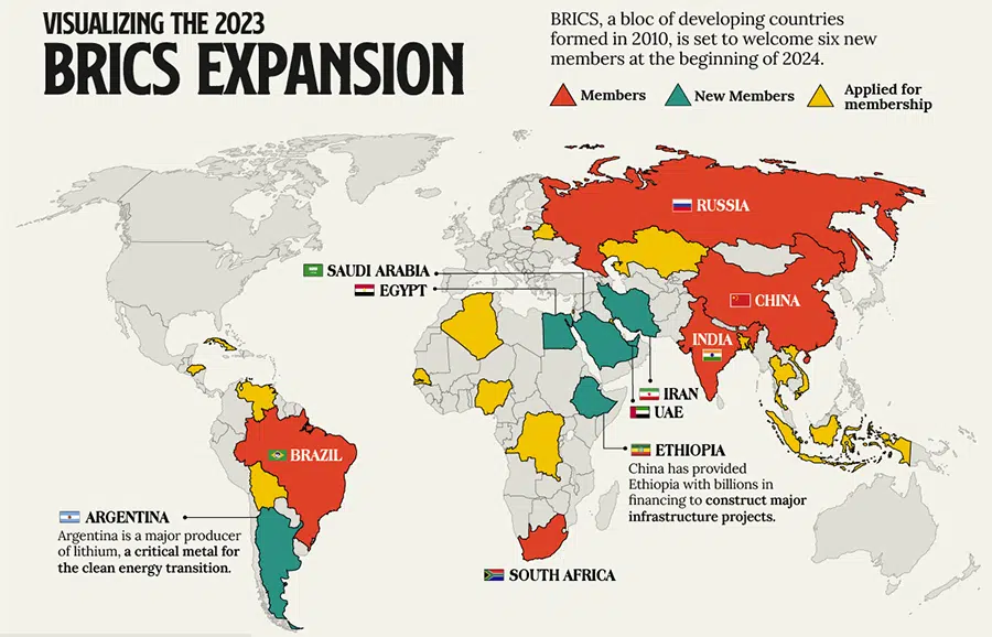 Diese Karte zeigt die Expansion der Organisation BRICS per 1. Januar 2024. Rot: Gründungsstaaten. Dunkelgrün: neue Mitgliedsstaaten per 1.1.2024. Gelb: Mitgliedschaftsbewerber. In einem Punkt ist die Karte nicht mehr aktuell: Der neue rechtspopulistische Präsident Argentiniens, Javier Milei, hat Anfang Dezember 2023 den von der vorherigen Regierung beschlossene Beitritt zur BRICS-Gruppe abgesagt.