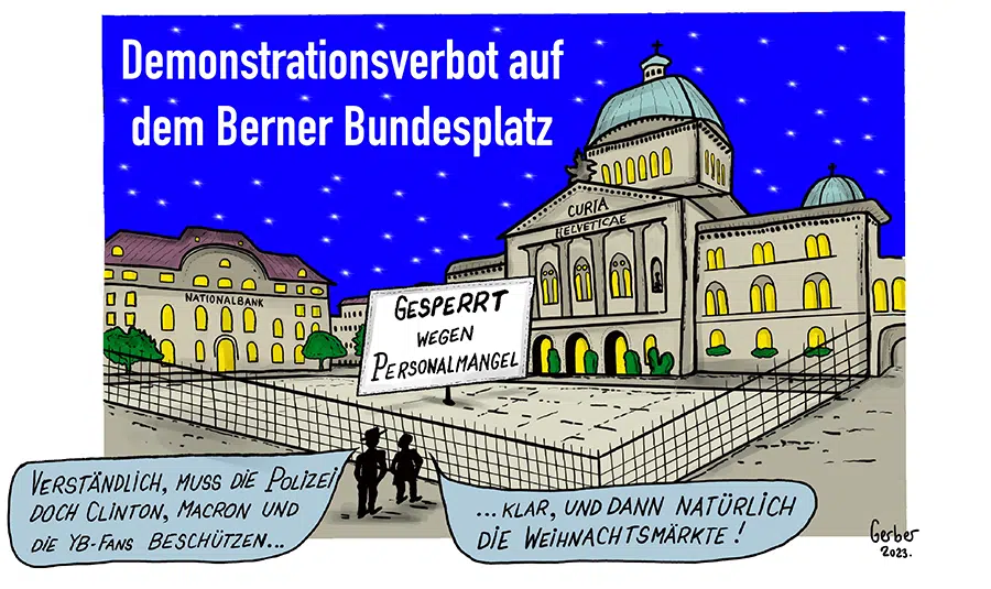 Der Bundesplatz gilt als symbolischer Ort für die politische Meinungsfreiheit in der föderalen Schweiz. Die 7‘000 Quadratmeter vor dem Bundeshaus und der Nationalbank haben immer wieder geschichtsträchtige Demonstrationen beherbergt – etwa für den Frieden und die Frauenrechte oder gegen AKWs und die Covid-Massnahmen. Doch jetzt hat die Berner Stadtregierung Grosskundgebungen in der Innenstadt bis vorläufig Weihnachten verboten. Der Bundesplatz dient also bloss noch dem Wochenmarkt oder Staatsbesuchen.